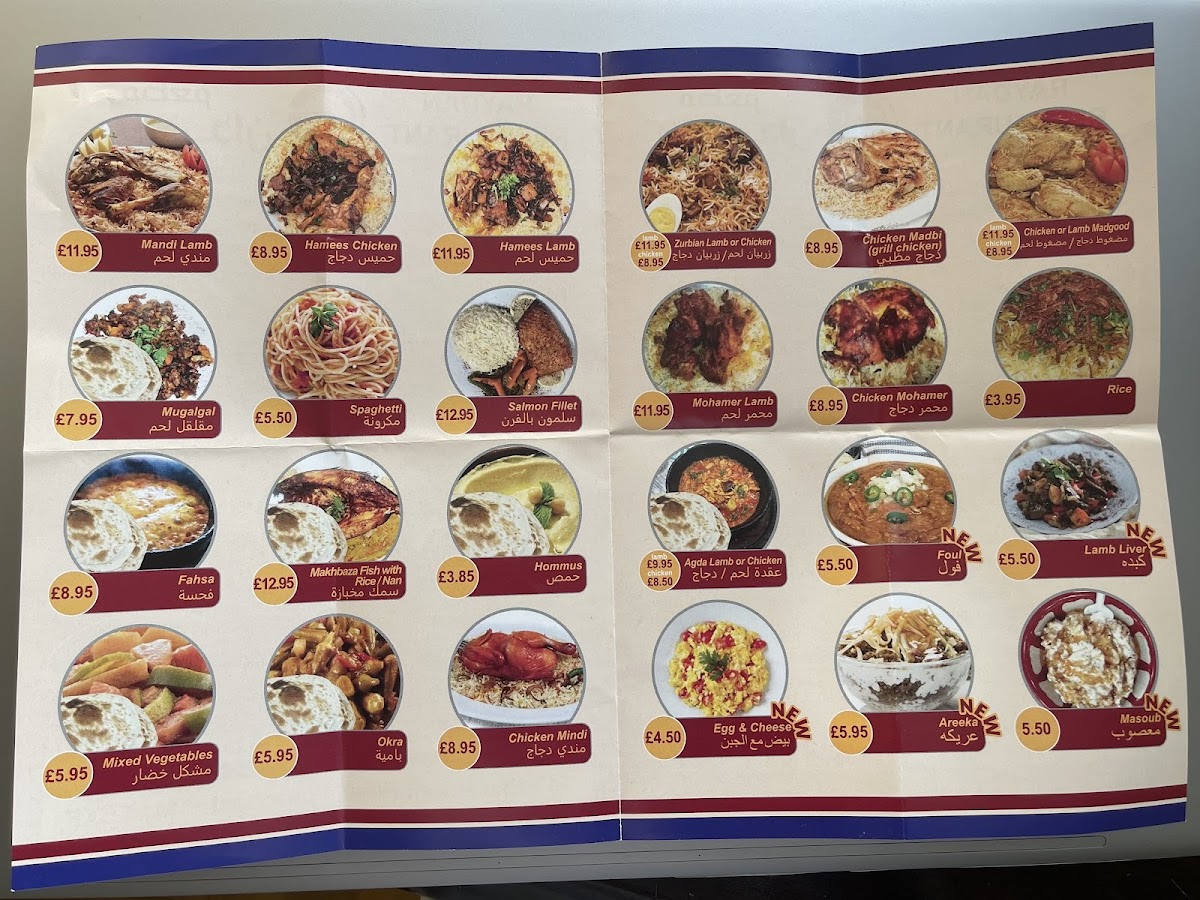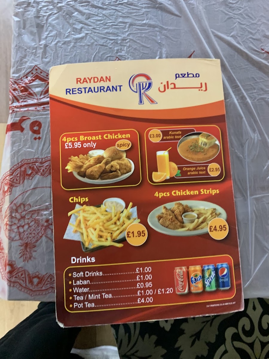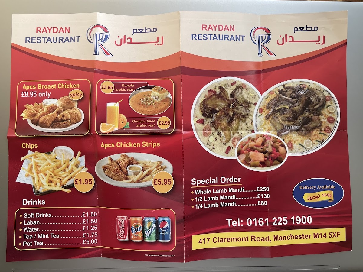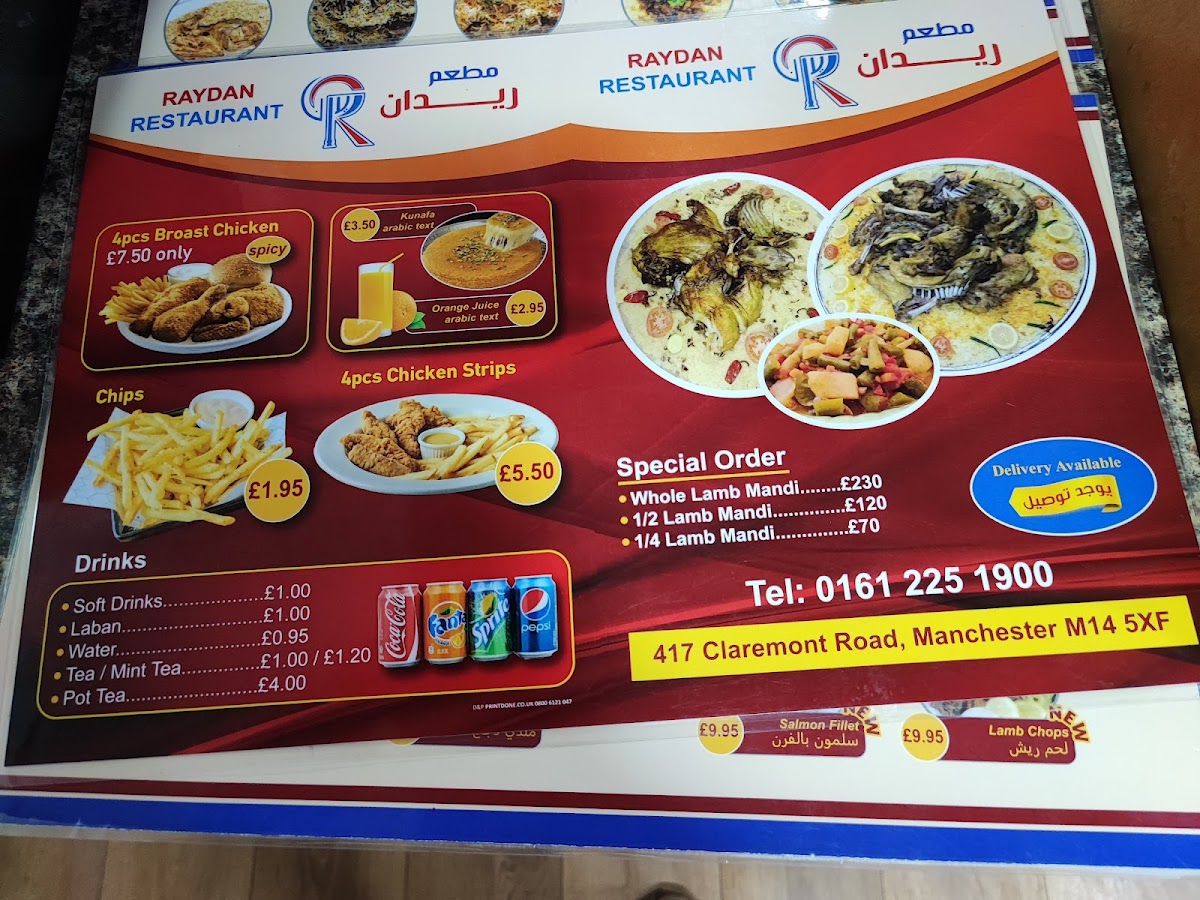 Welcome to Raydan Restaurant, where our menu is filled with a variety of mouth-watering dishes that are sure to satisfy your cravings. From the savory Lamb Mandi to the crispy Chicken Broasted Chicken, our specialties are a must-try for any food enthusiast. Indulge in our flavorful Chicken Biryani or enjoy our complimentary Soup and Chips as a delightful appetizer. Don't miss out on our Yemeni Mandi, Broast, Chicken Broast, Agdah Lamb, and more. Finish off your meal with our delectable Tiramisu or a traditional Knafeh. Come dine with us at 417 Claremont Rd in Manchester and experience a culinary journey like no other!